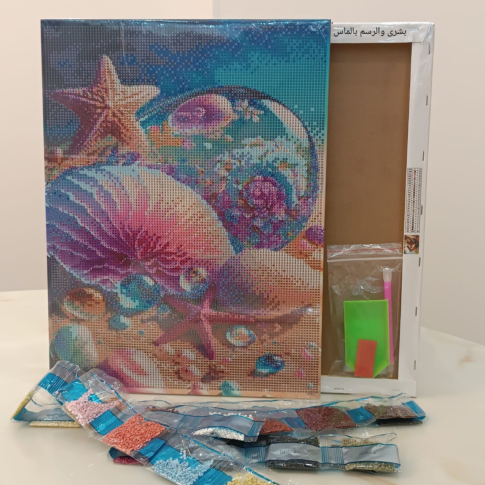اللوحة جاهزة للتعليق، وبتوصلك كاملة بكل أدواتها: قلم مزدوج ثلاثي، شمع، طبق، وأكياس فتح وغلق — كل ما تحتاجيه عشان تفنني في لوحة من البريق 💎والإبداع